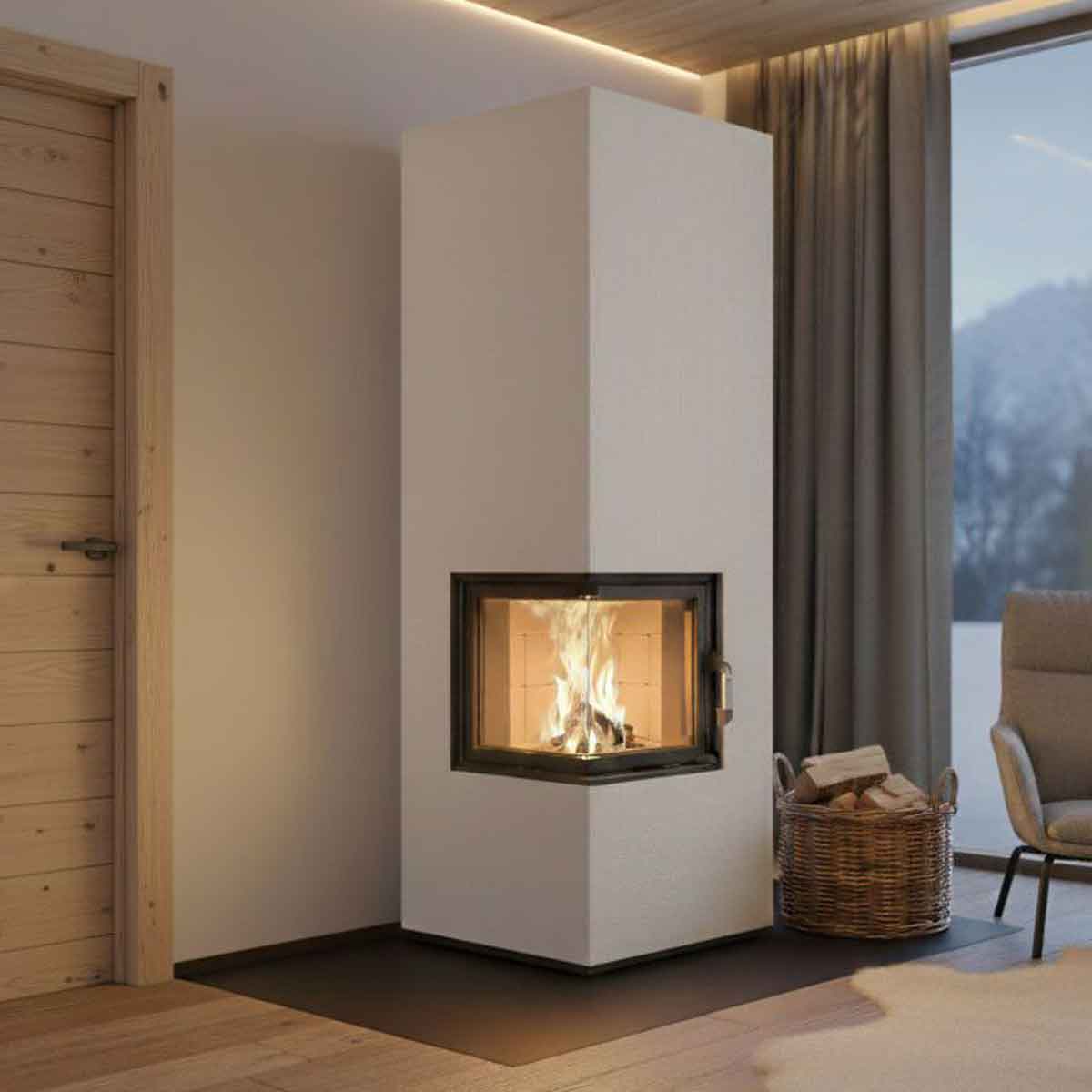 Lieferumfang: Feuerraum komplett, Typ B Plus 90° mit Feuerraum-Podest, Außenhülle aus BRULA Wärmespeicherplatten, 1 Sack FF-Rapidhaftmörtel 20 kg, 3 Sack Brillantputz weiß 1 mm Körnung (20 kg)