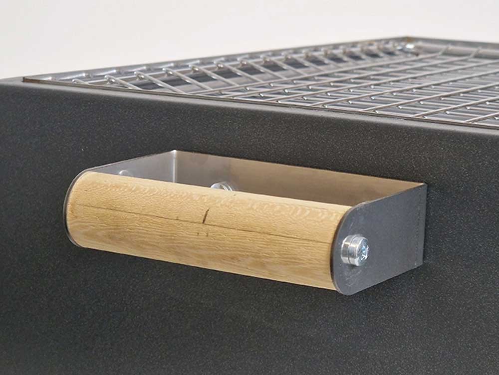 - Materialien: Gehäuse Stahl, Kohlewanne und Rost Edelstahl, Griffe & Füße Holz