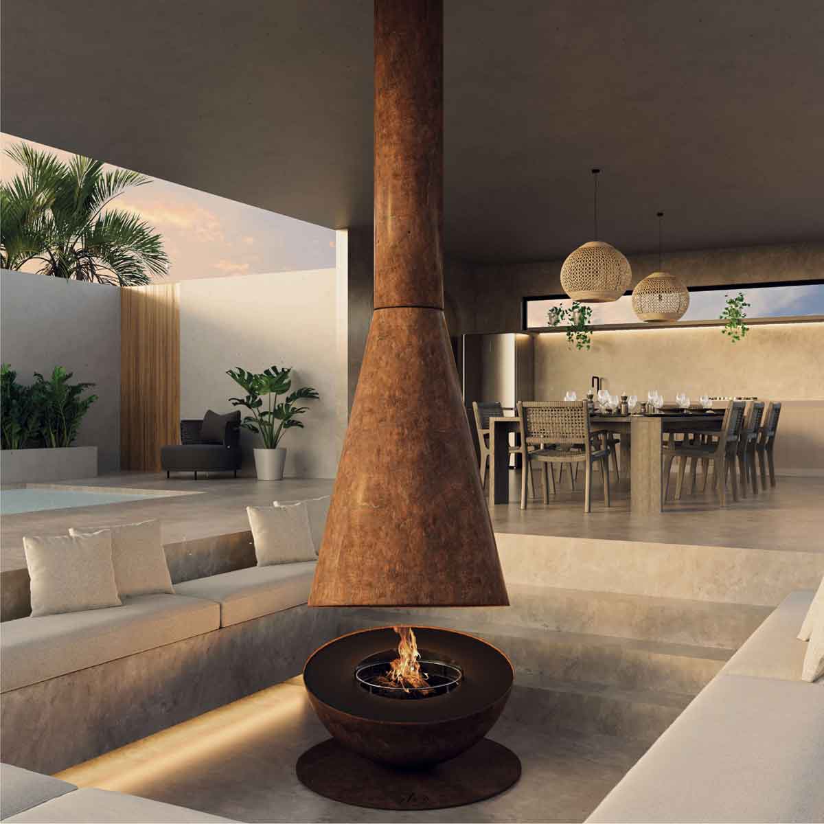 Erleben Sie die Harmonie und den Charme von rustikalem Holz und zeitlosem Luxus mit dem Thales Kaminofen, der Ihre Abende mit Wärme und bleibenden Erinnerungen bereichern wird. Entdecken Sie die perfekte Kombination aus Luxus und Komfort mit dem neuen hängenden Brennholzofen, inspiriert von Thales, dem ikonischen Kamin von GlammFire. Dieses exquisite Stück für Ihren Außenbereich verbindet die einladende Anziehungskraft von Holz mit dem zeitlosen Luxus von Thales und ist die beste Wahl für Ihre Veranda. Sein elegantes Design und die hohe Qualität verwandeln Ihre Veranda in einen stilvollen Rückzugsort und schaffen unvergessliche Momente rund um die fesselnden Flammen und das Knistern des Holzes.