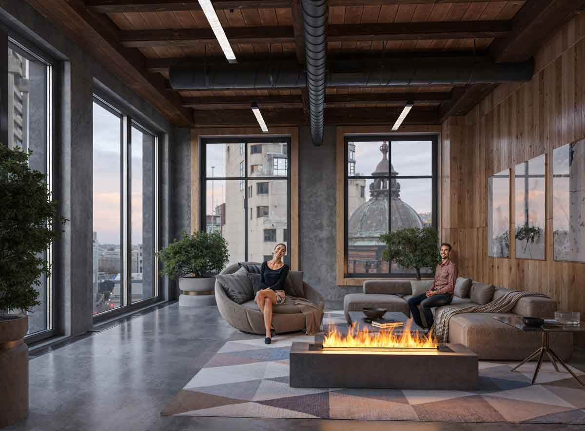INFIRE Bioethanol-Kamine mit ökologischem Flüssigbrennstoff, dank dem man echtes Feuer in Wohnungen, Restaurants, Hotels und praktisch allen anderen Innenräumen genießen kann, da diese keinen Schornstein oder andere Lüftungssysteme erfordern.