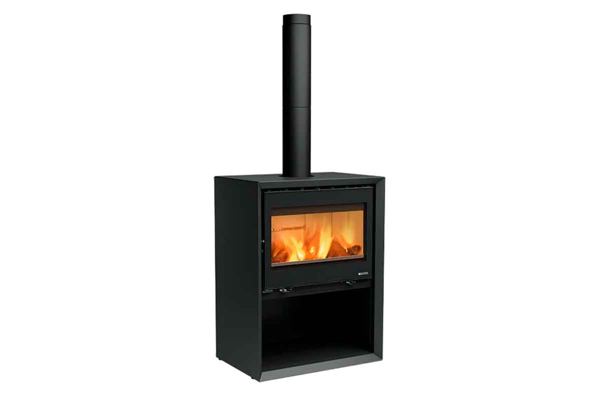 Dante mit Holfach verbindet die Eleganz eines Kamins mit der Leistung eines Ofens und bringt dank der großen Glastür und der abgesenkten Feuerstelle die ganze Schönheit und Kraft des Feuers zur Geltung. Erhältlich in der praktischen Version mit niedrigerem Feuerraum oder mit der eleganten horizontalen Bank, auf der das Produkt nach Belieben je nach ästhetischen oder Installationsanforderungen platziert werden kann.