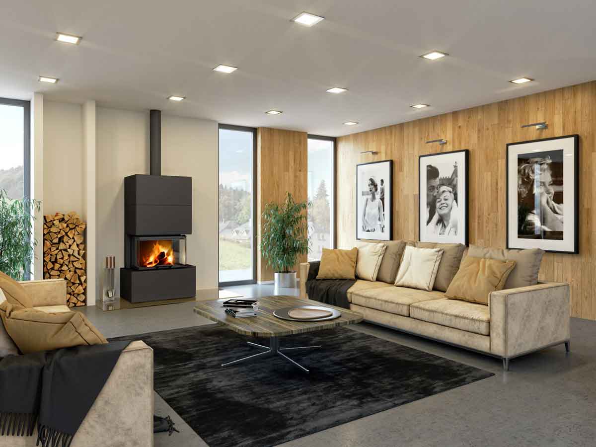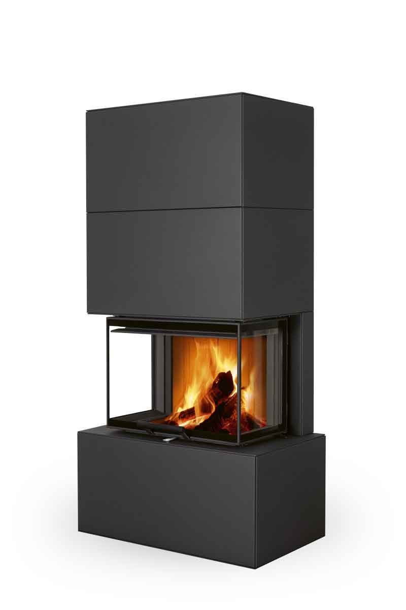 Unser Design-Kamin LUCERIA C Stahl kombiniert die besten Eigenschaften eines Kaminofens und eines Kamineinsatzes. Wie ein freistehender Kaminofen kann der Design-Kamin schnell und einfach an Schornstein und externe Luftzufuhr angeschlossen werden. Gleichzeitig bietet sein Konzept aber auch die Optik eines Kamineinsatzes - insbesondere die elegante Schiebetür, welche Ihnen einen freien Blick auf die Flammen von drei Seiten eröffnet.