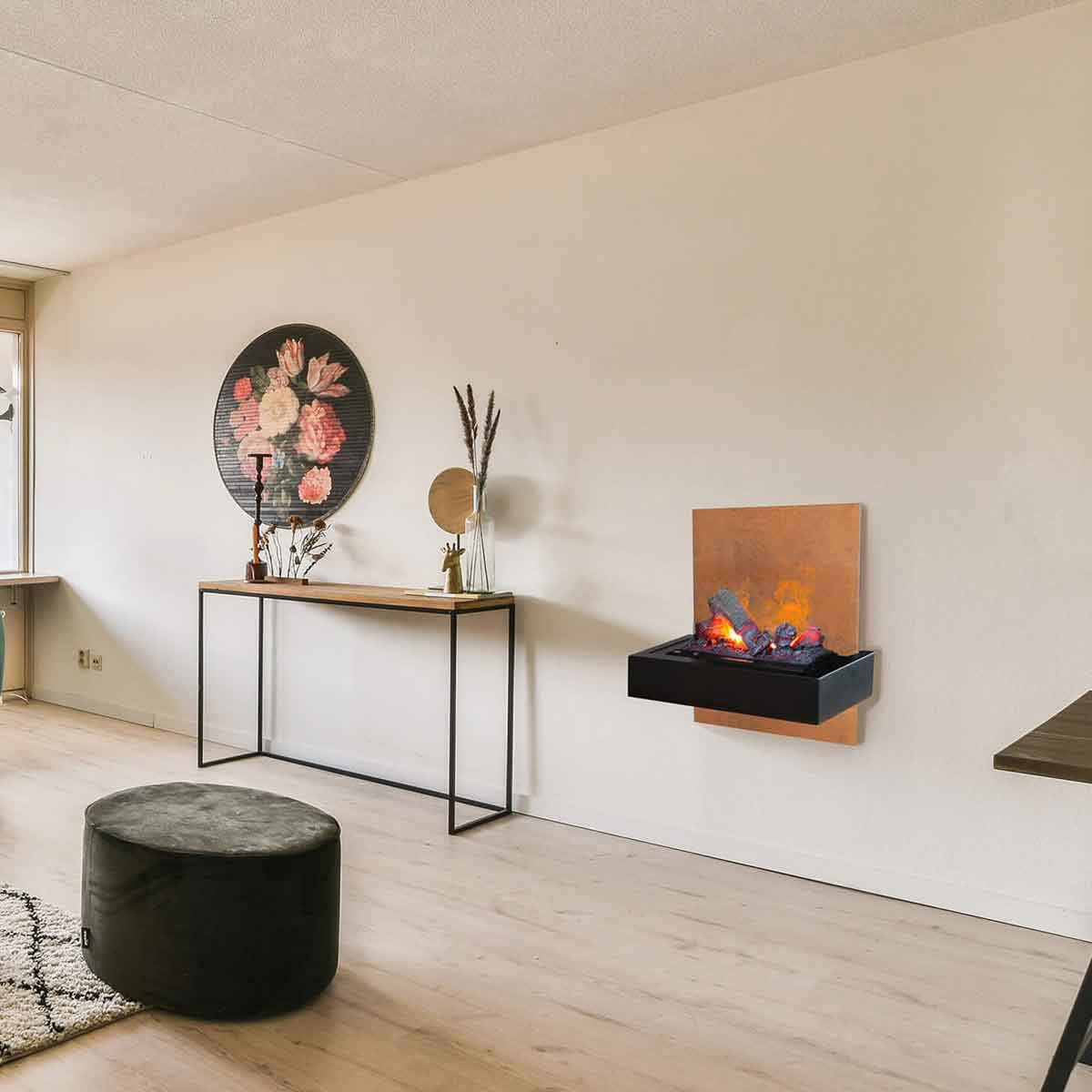 Die schwarze Rückwand oder der schwarze Spiegel verleihen dem Feuer optisch mehr Tiefe und lassen es größer erscheinen. Cortenstahl ist eine Stahlsorte, die ihre schöne rostige Farbe durch die Oxidation einiger Zusatzstoffe wie Kupfer erhält. Diese Schicht schützt das Material und kann in den ersten Jahren noch die Patina (Zeichnung) verändern. Die Naturstein-Rückwand und jede Rückwand aus Corten ist ein Unikat.