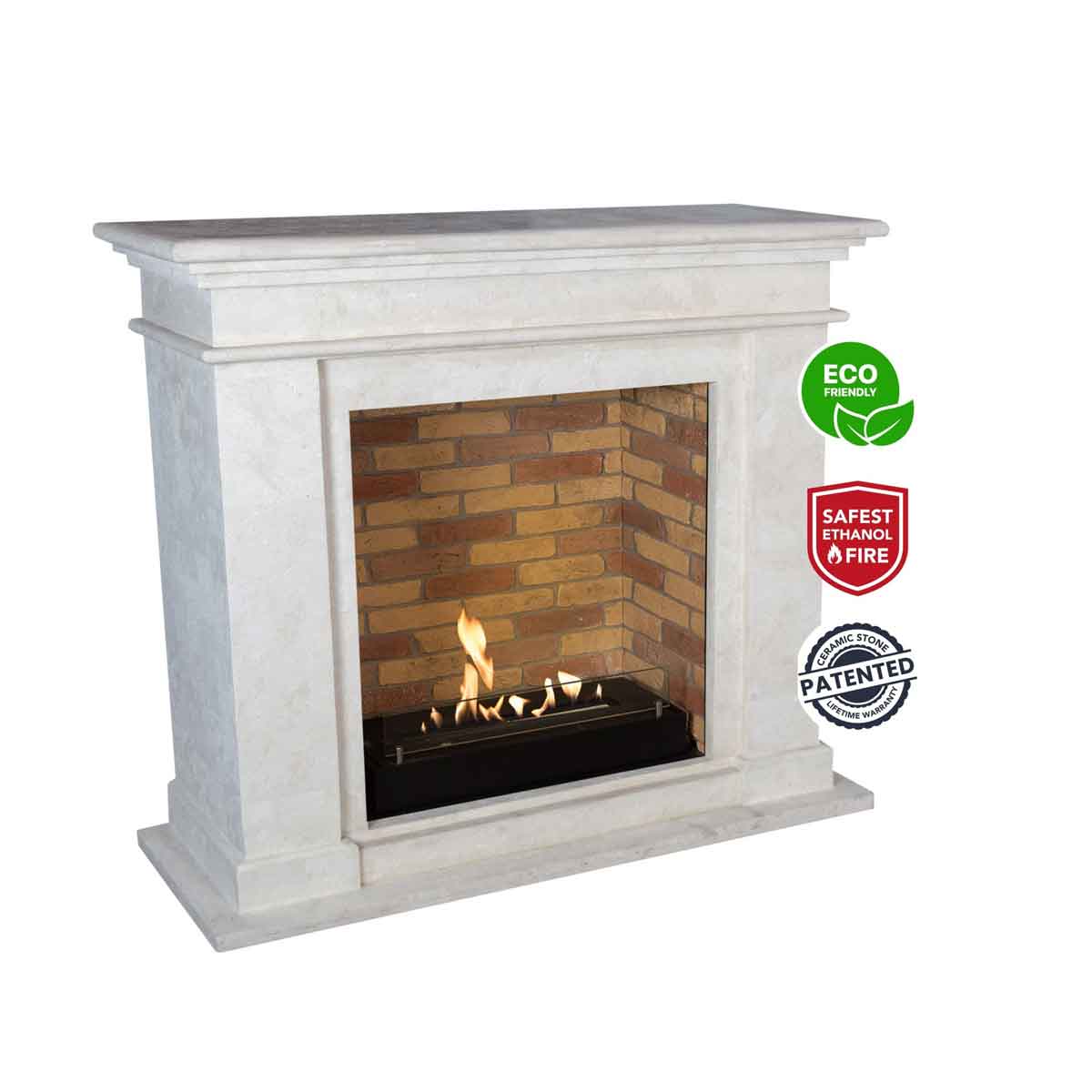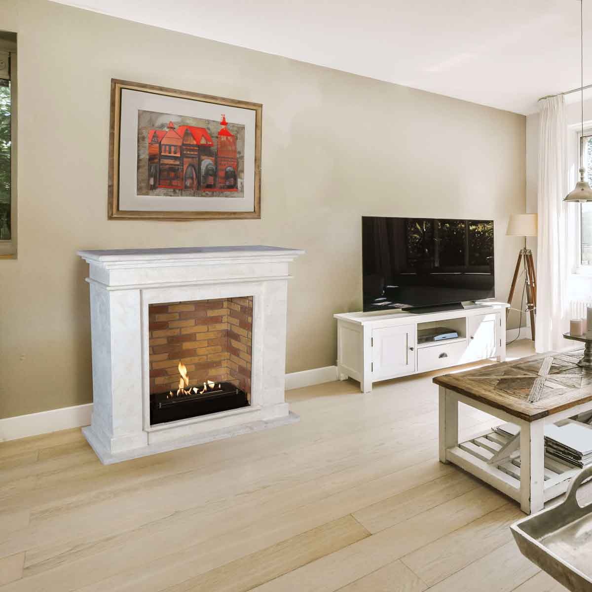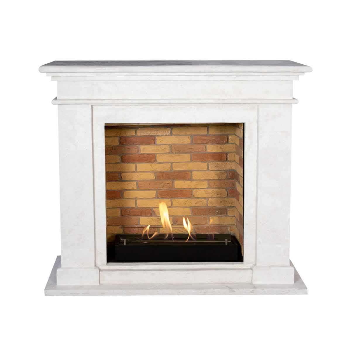 Xaralyn Kos Stein Weiß mit Steindekor – Ethanolkamin aus Naturstein mit natürlichem Flammenspiel