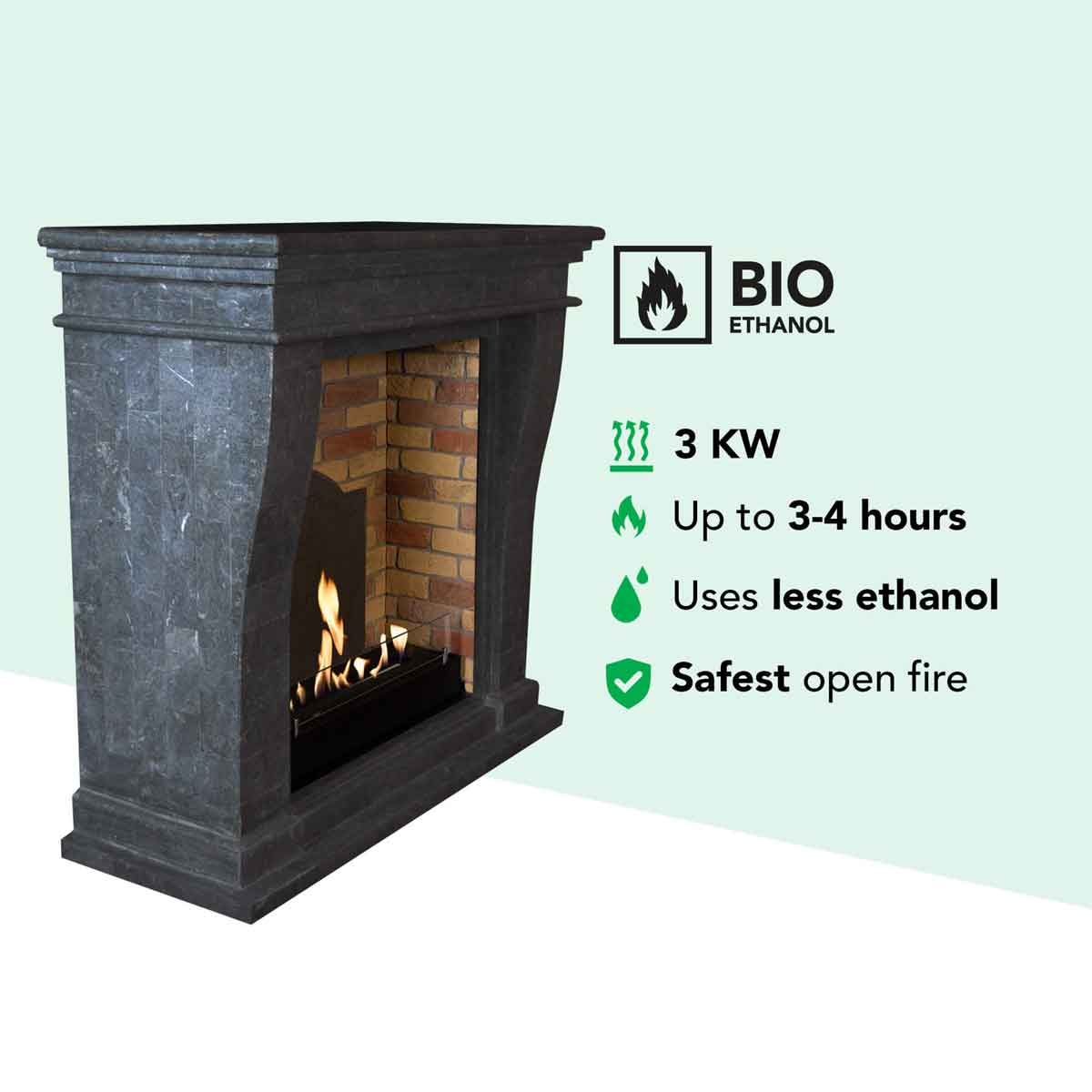 Natürliches Feuer – ganz ohne Rauch oder StromDer Bioethanoleinsatz mit Einbaubrenner L mit Steindekor erzeugt echte Flammen durch die Verbrennung von Bioethanol, einem umweltfreundlichen, erneuerbaren Brennstoff. Es entsteht kein Rauch, kein Ruß und kein Geruch, sodass keine Installation eines Schornsteins erforderlich ist.