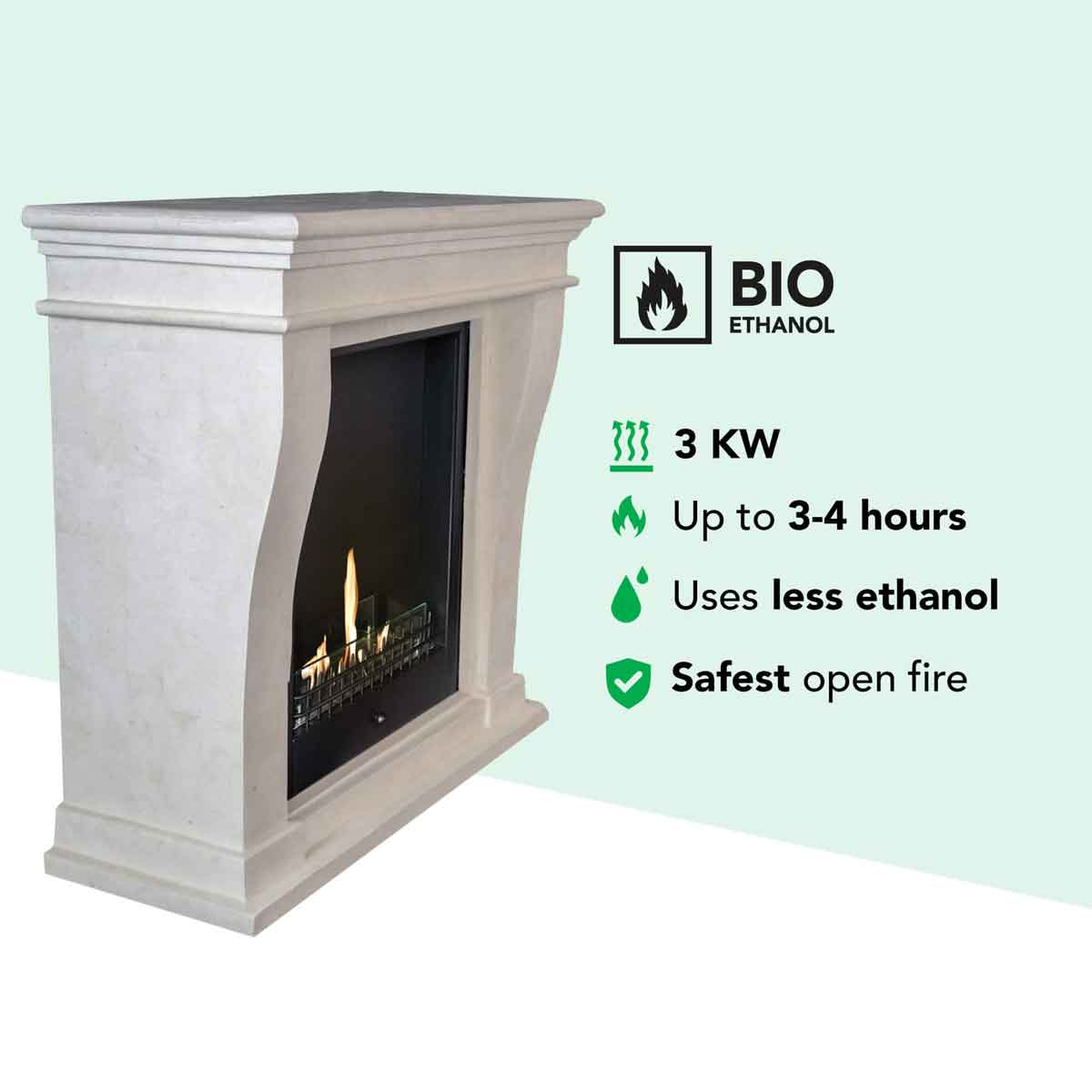 Bei der Verbrennung von reinem Bioethanol entstehen weder Ruß noch Rauch oder schädliche Abgase. Das Ethanol reagiert mit Sauerstoff zu Kohlendioxid (CO₂) und Wasser – letzteres trägt sogar zu einer angenehmeren Luftfeuchtigkeit im Raum bei.