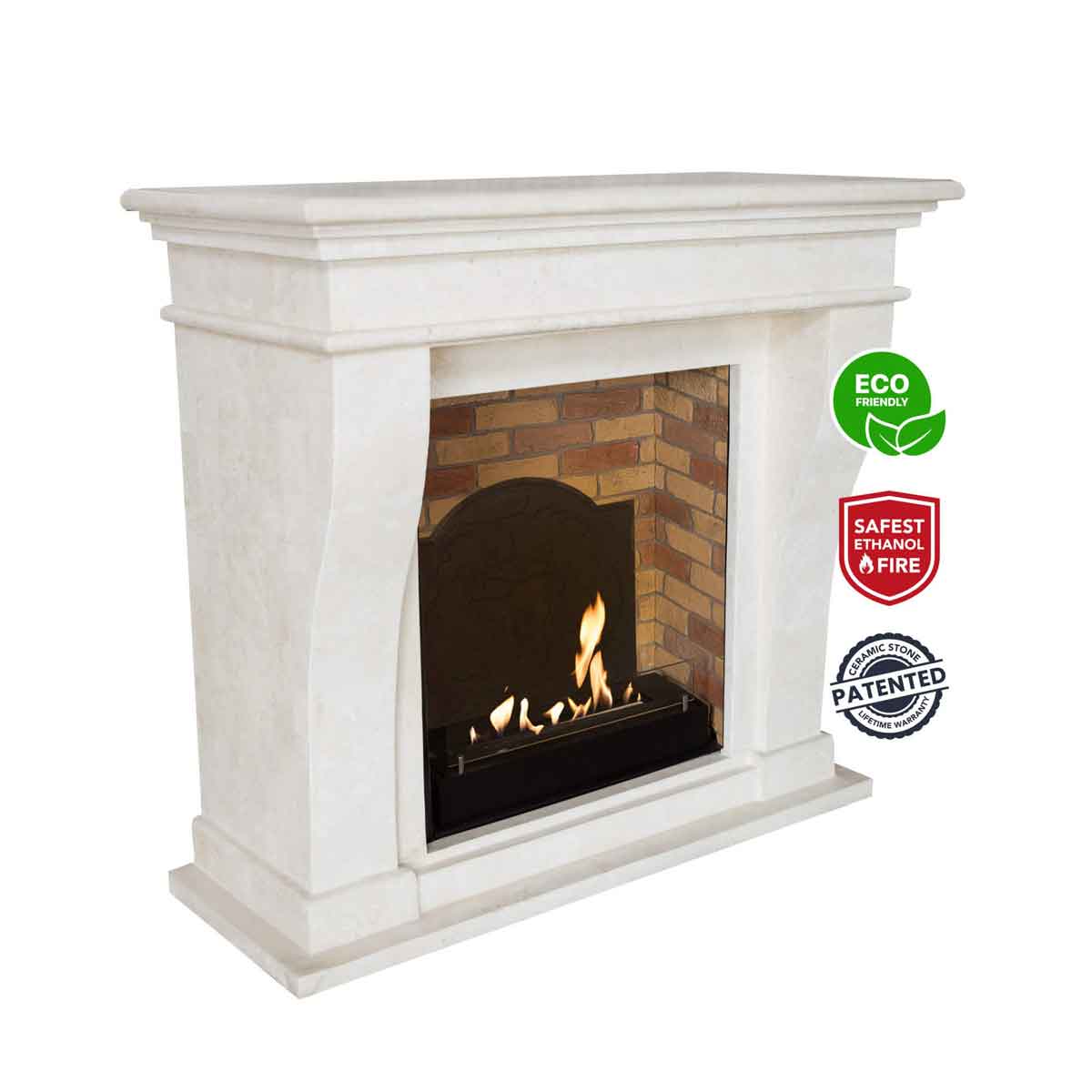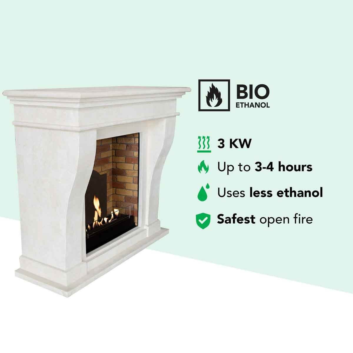 Xaralyn KRETA Stein Weiß/Dekor/Medaillon – Ethanolkamin aus Naturstein mit natürlichem Flammenspiel