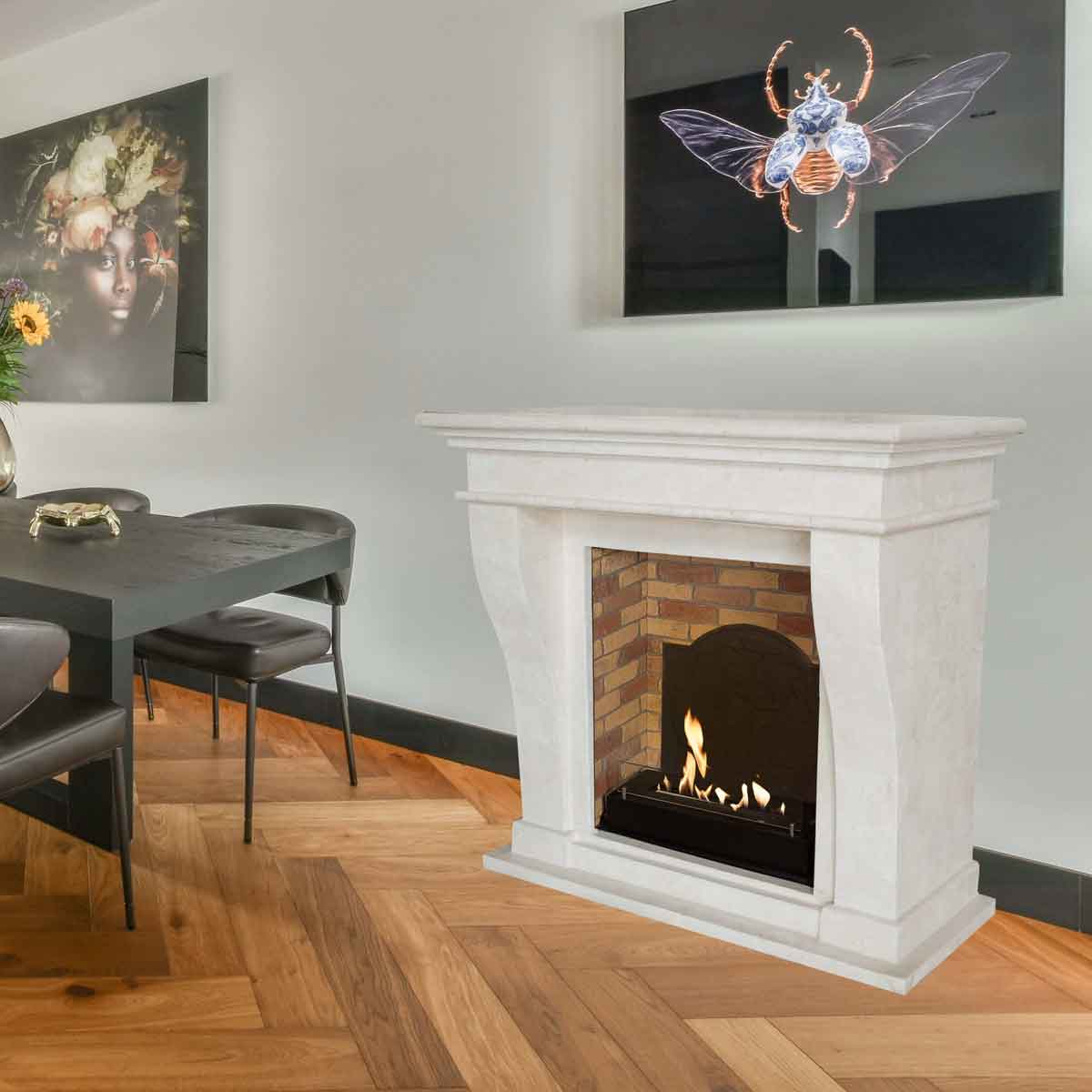 Der Xaralyn Kreta hat ein klassisches und elegantes Design. Die Seiten sind sanft nach innen geschwungen, was dem Kamin eine anmutige und raffinierte Ausstrahlung verleiht. Die breite, profilierte Abdeckplatte mit dezentem Überstand sorgt für Ausgewogenheit und eine würdige Erscheinung. Der Kaminsims steht auf einem leicht hervorspringenden Sockel, der ihm eine solide Basis verleiht. Dank der fließenden Linien passt dieses Modell sowohl in klassische als auch moderne Wohnräume. Durch das Steindekor mit dem Medaillon entsteht eine besonders klassische Optik.