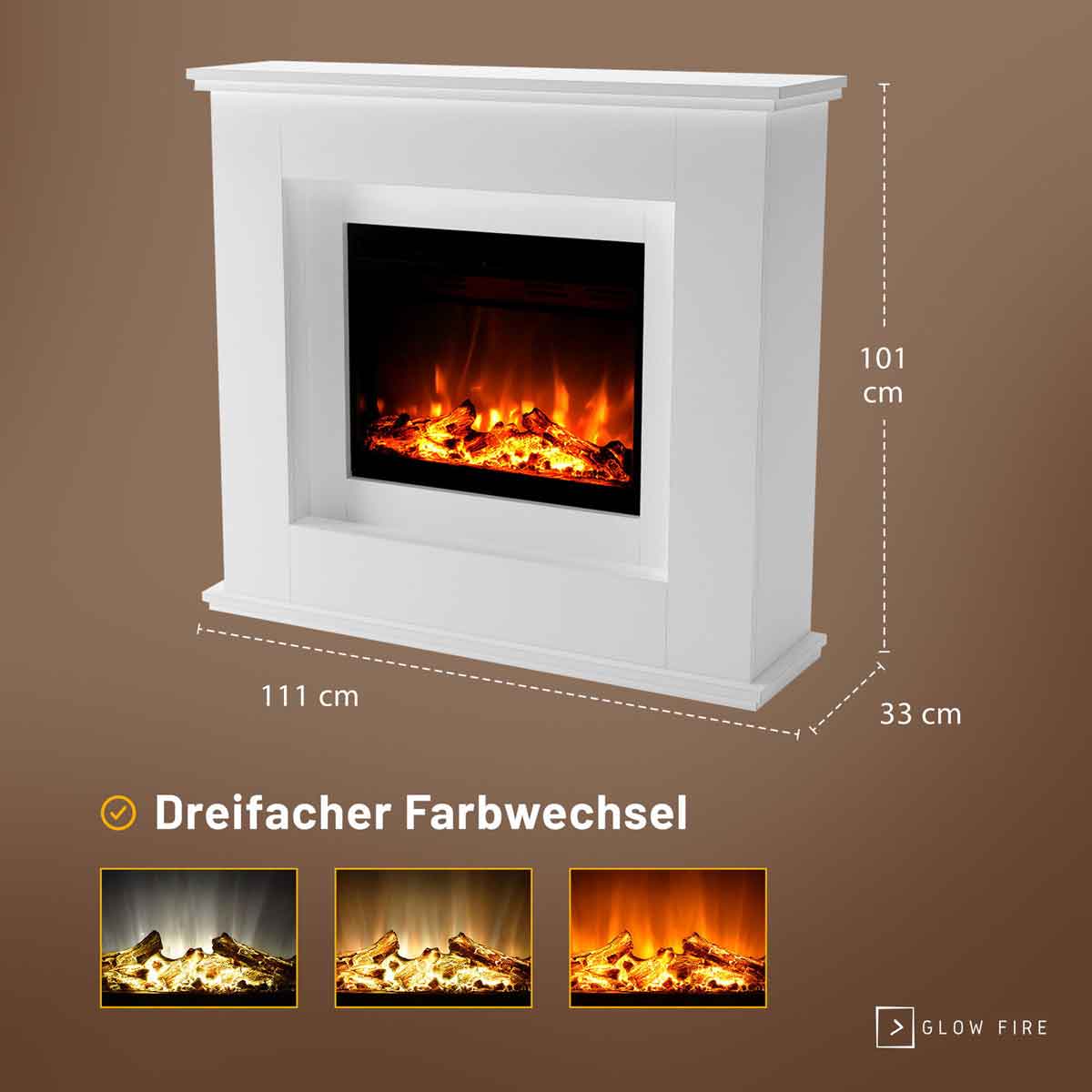 Product Features & Benefits Flame Effect & Ambience: LED flames with 3 color tones, 4 brightness levels, and an integrated crackling sound create a deceptively realistic flame image.
