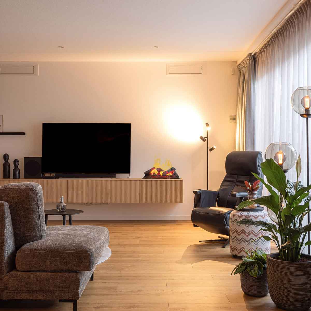 The Jörne Long electric fireplace consists of a furniture-panel body and is part of a furniture concept with four different finishes. It is perfect as a decorative fire element in the living room, dining room, or office. The sideboard offers ample storage space: the two left-hand compartments fold down for easy access – ideal for storing appliances, accessories, or other items.