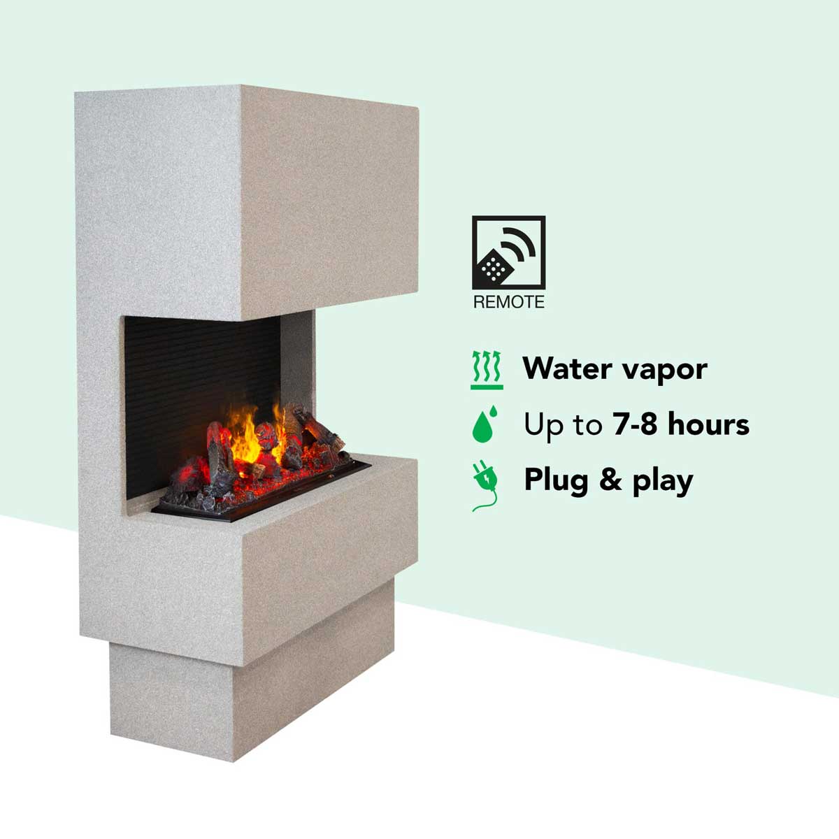 A water tank, 5 lamps each of 50 watts (12 volts) and 2 ultrasonic nebulizers conjure an indescribably authentic flames. Indistinguishable from real fire. With a filled water tank of 1.7 liters, the fireplace burns around 8-10 hours. The released ultrafine water vapor also contributes to the improvement of the living environment. The flame intensity is adjustable and a comfort remote control ensures easy handling
