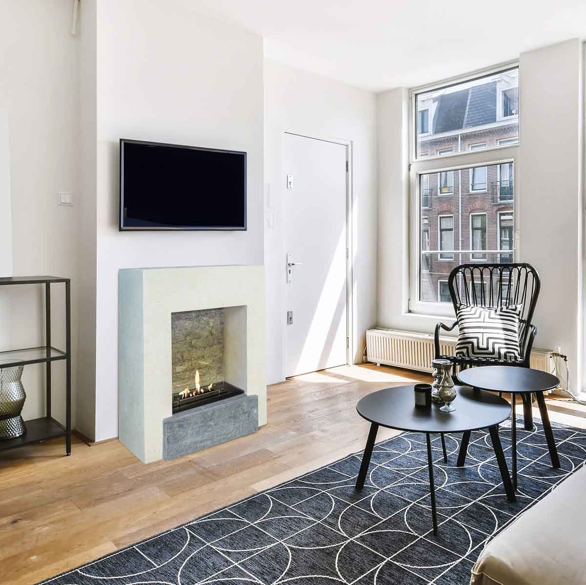 Setting up the fireplace is straightforward and can be done yourself (only the weight requires some care). Since no chimney or connection is needed, the fireplace can be placed anywhere – whether in rented apartments, conservatories, party rooms, or offices.